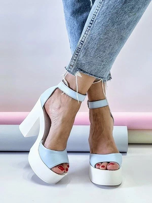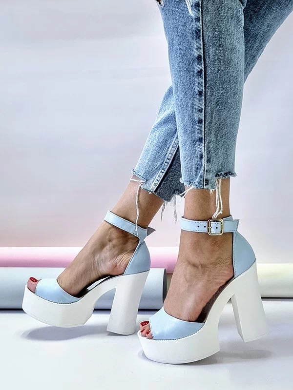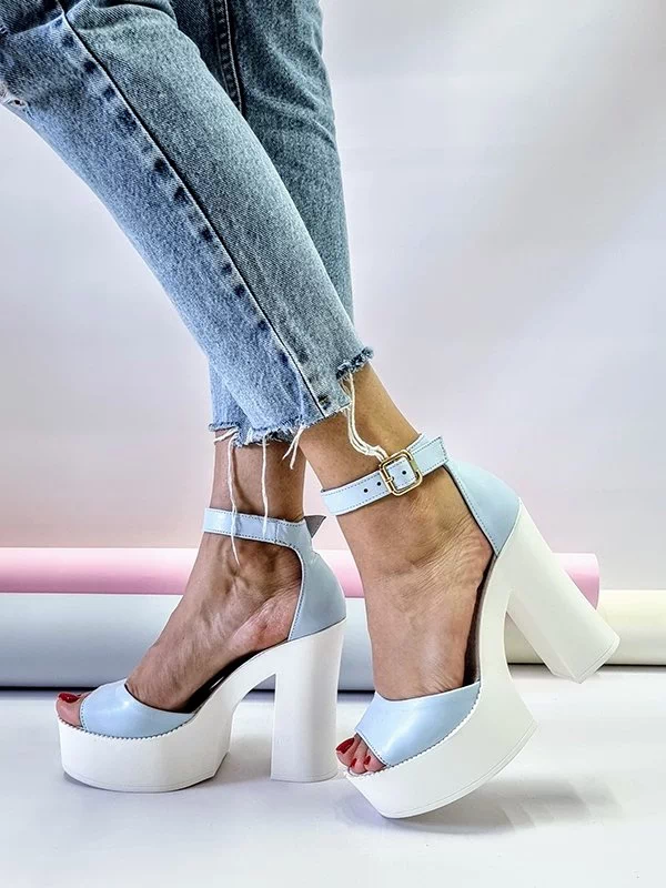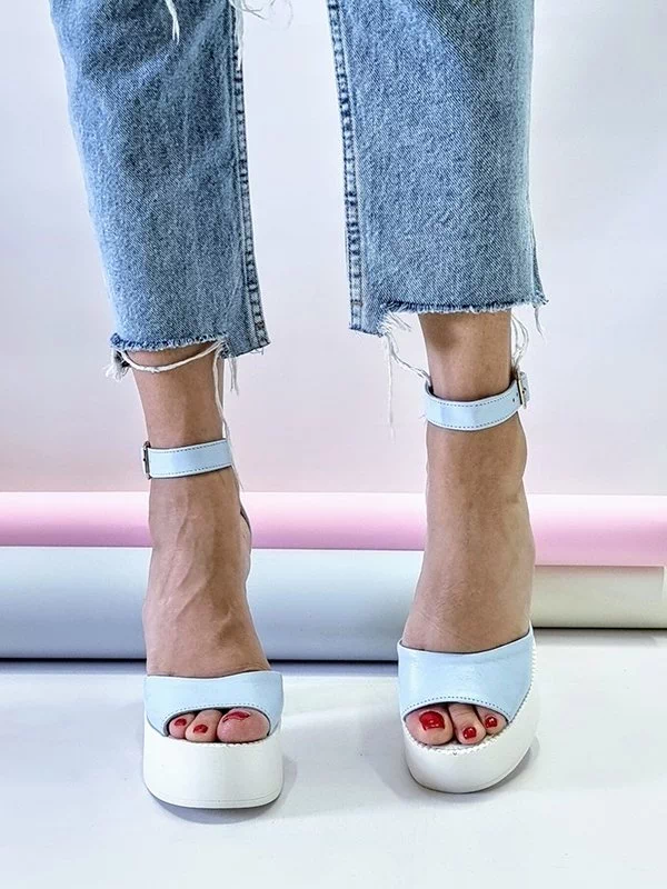 Голубые кожаные босоножки на платформе с каблуком