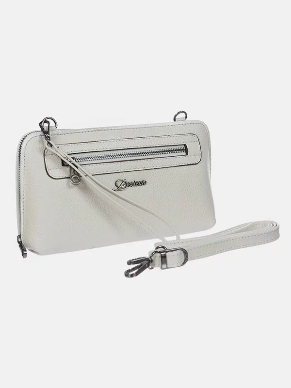 Женская сумка D-2158 – прекрасный вариант для денег, различных мелочей (косметики, ключей, павербанков, наушников, смартфонов, зарядных устройств и т.п.). Пошита из зернистой натуральной кожи флотар в белом исполнении. Сумка неприхотлива в уходе, имеет эффектный внешний вид, качественный пошив. Добавит элегантности практически любому образу. Страна производитель бренда – Турция.