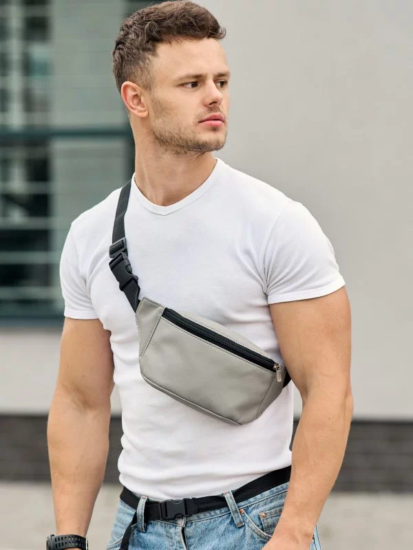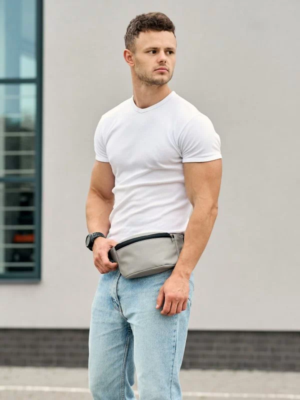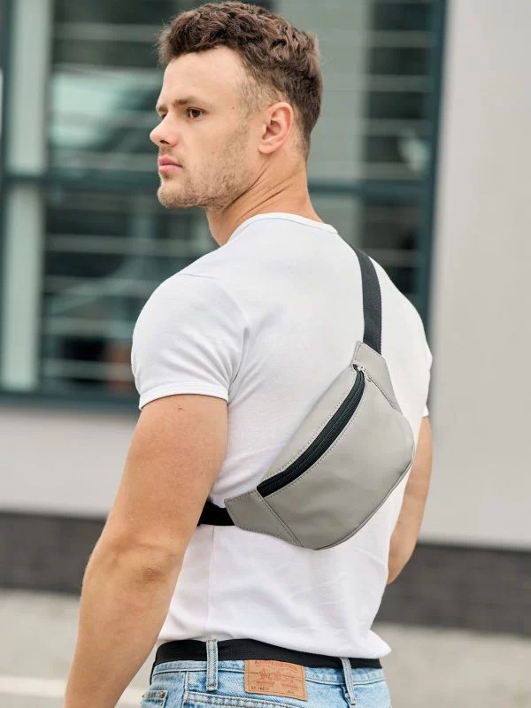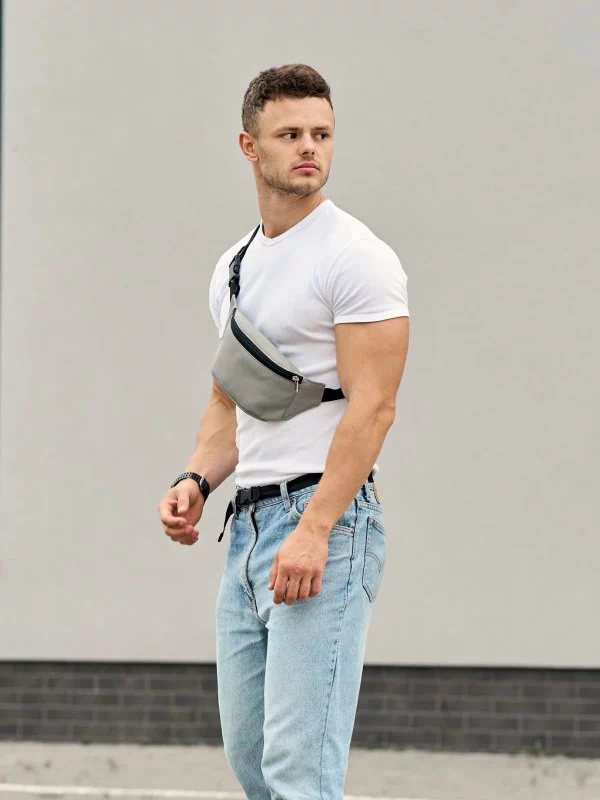 Приголомшуюча чоловіча сумка-бананка у сірому виконанні на будь-які випадки життя.