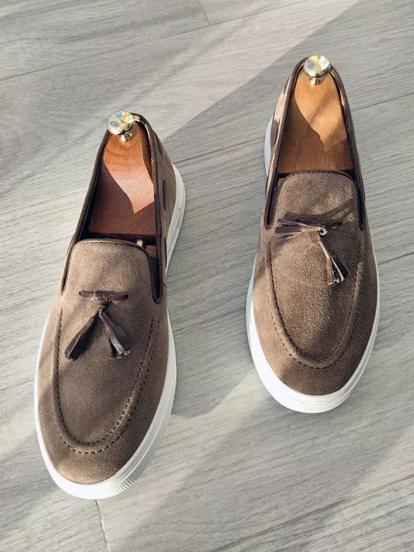 Яркие мужские лоферы с кисточками, в бело-бежевом исполнении на все случаи жизни.