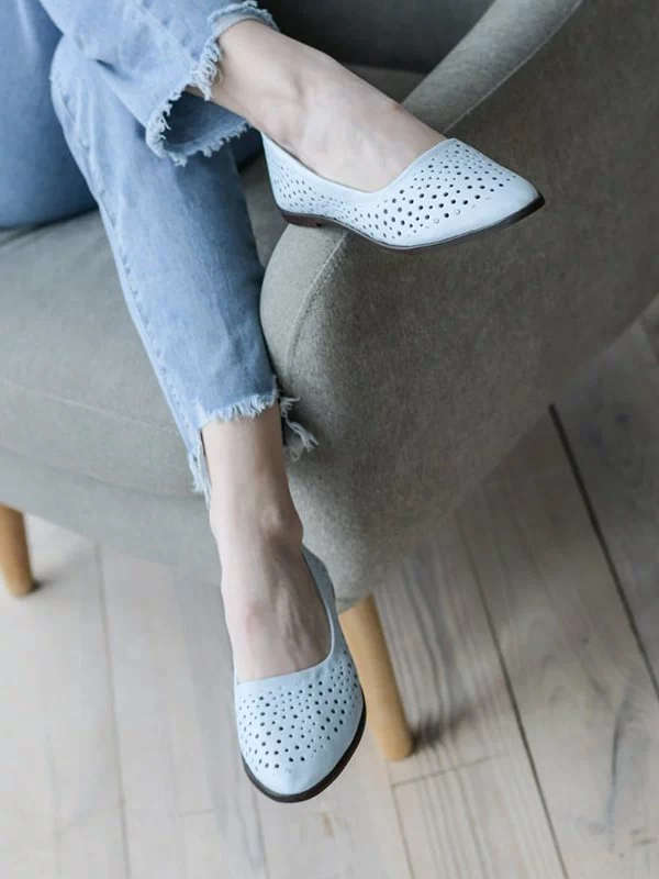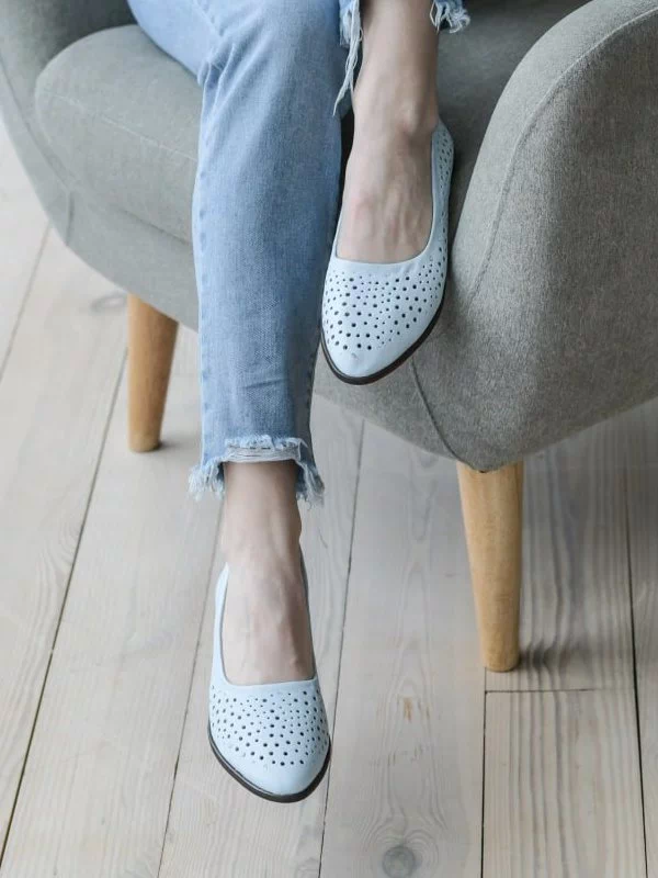 Голубые кожаные летние балетки с перфорацией в горошек