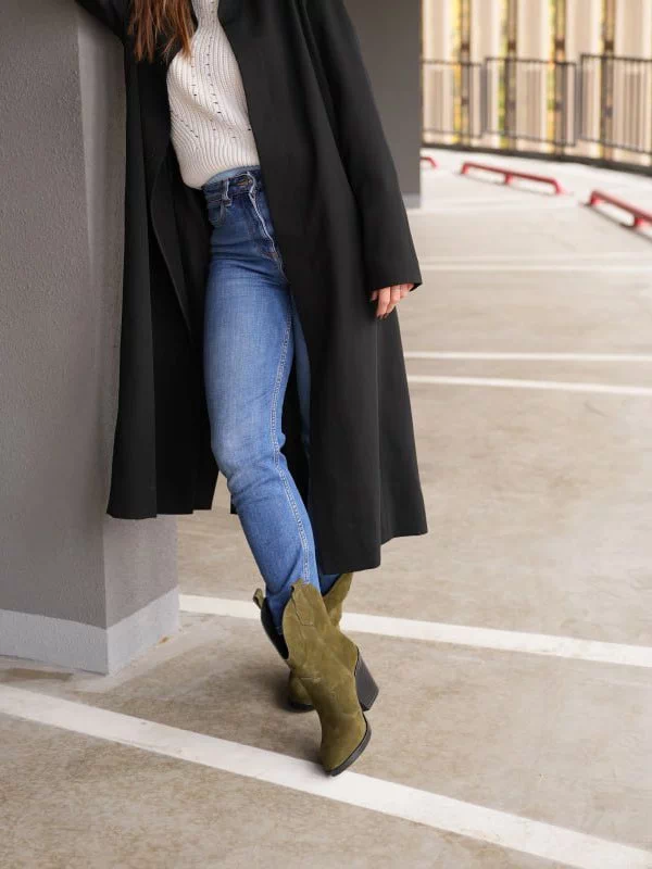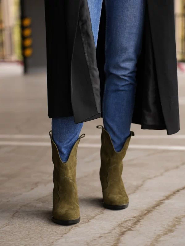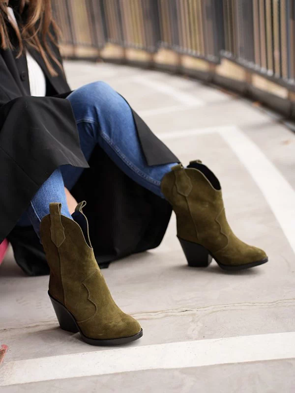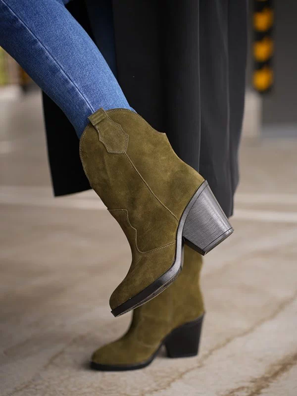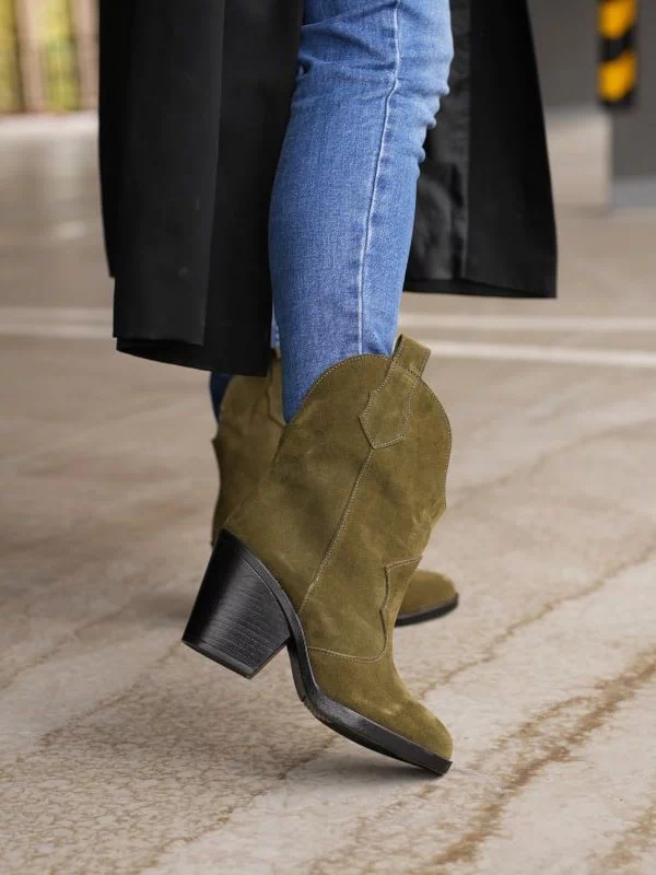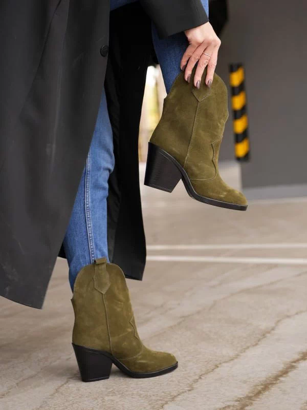 Яркие зимние женские ботильоны-казаки оттенка «хаки» на любые случаи жизни.