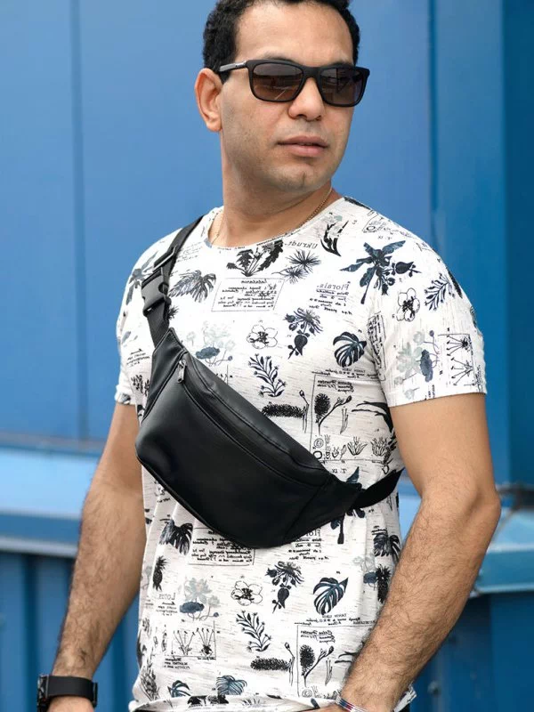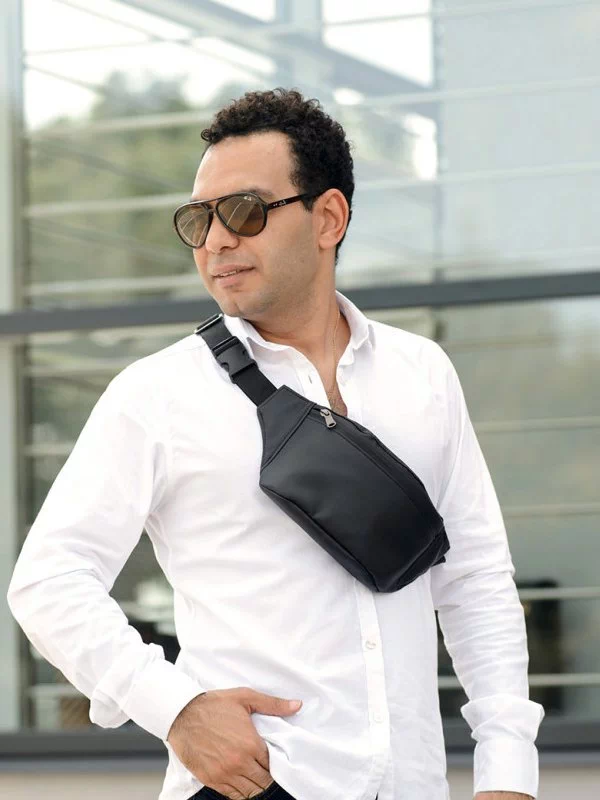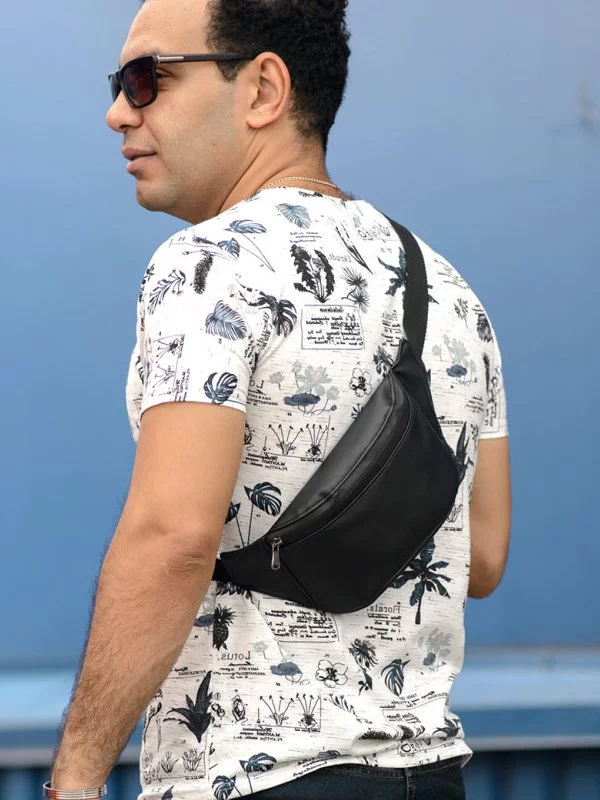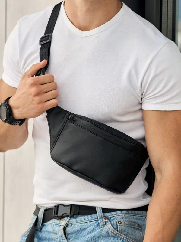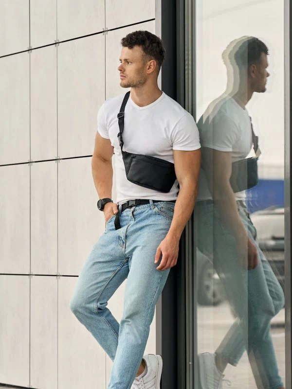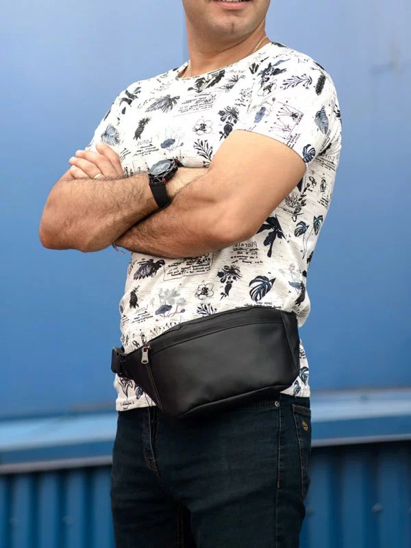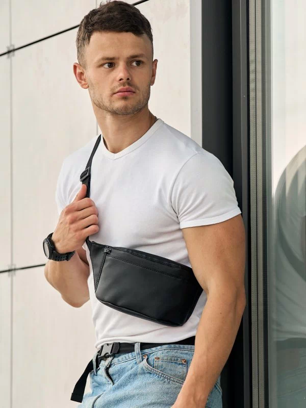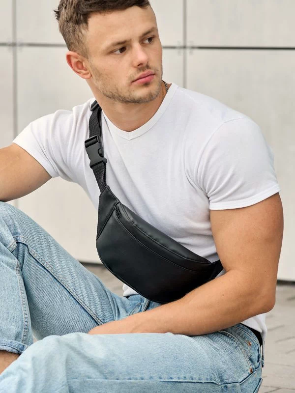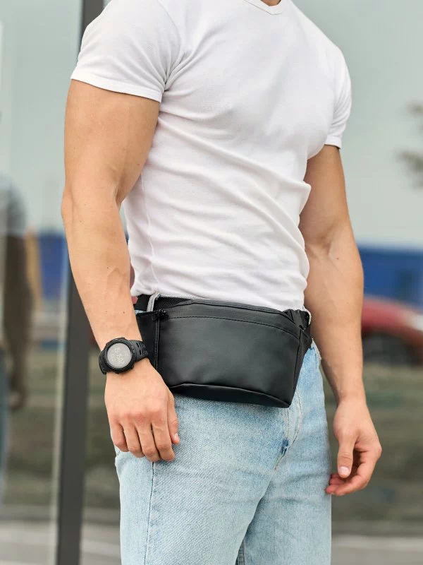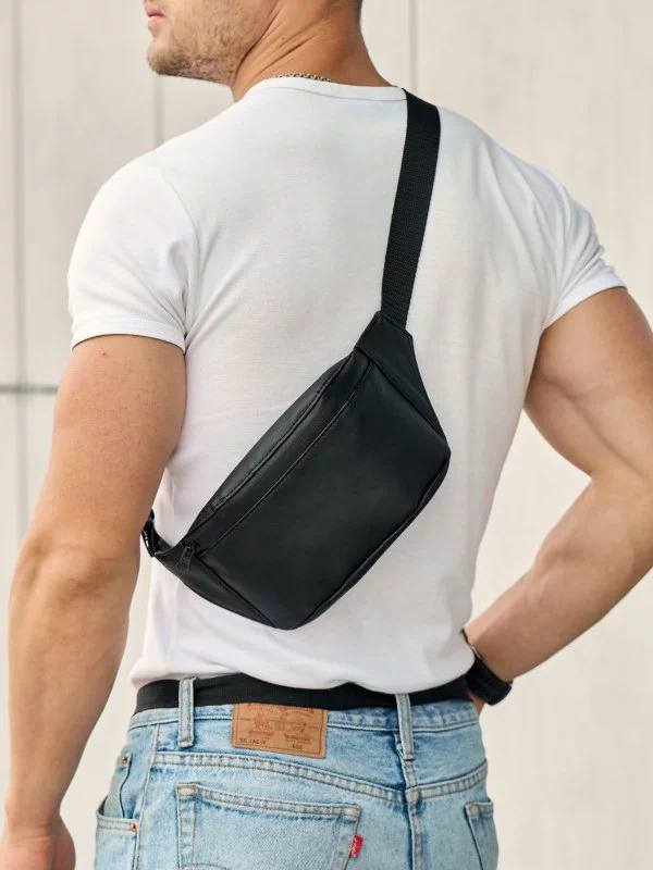 Яркая мужская сумка-бананка в чёрном исполнении на любые случаи жизни.