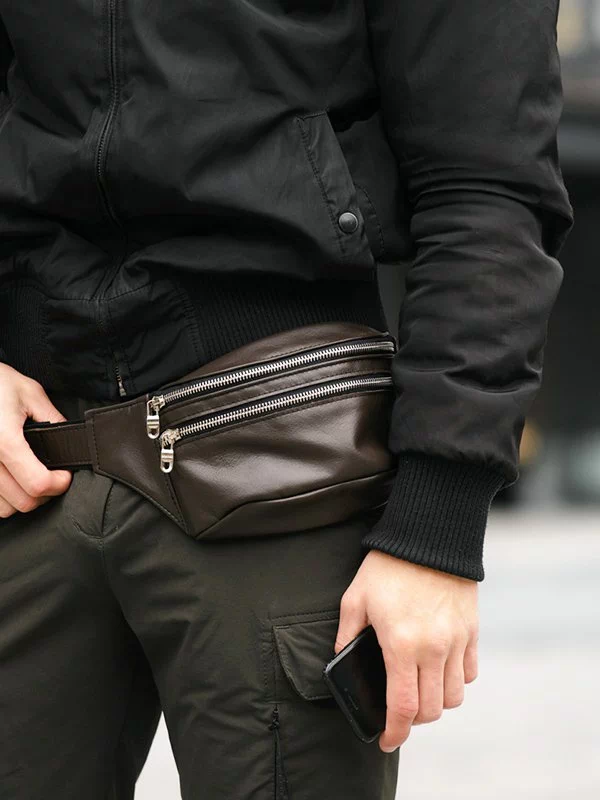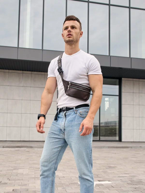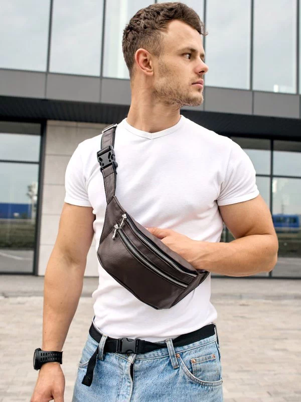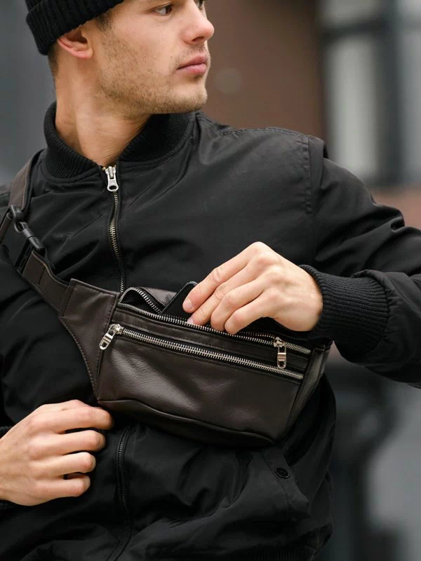 Восхитительная мужская сумка-бананка тёмно-коричневого цвета на все случаи жизни.