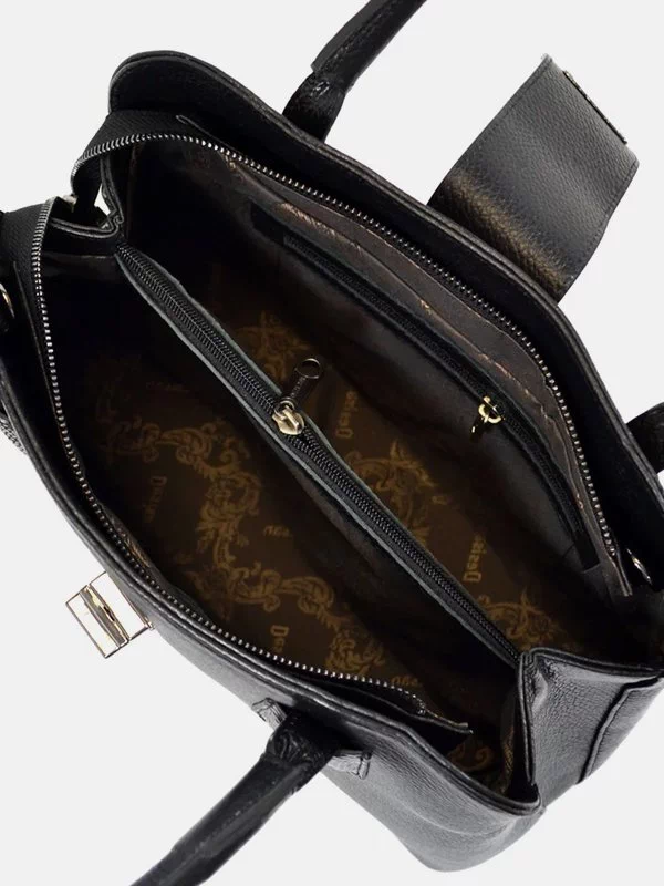 Женская сумка D-7101 – правильный выбор для небольших вещей, различных мелочей (косметики, денег, ключей, павербанков, наушников, смартфонов, зарядных устройств и т.п.). Пошита из фактурной натуральной кожи флотар черного цвета. Сумка неприхотлива в уходе, имеет эффектный внешний вид, качественный пошив. Добавит элегантности практически любому образу. Страна производитель бренда – Турция.