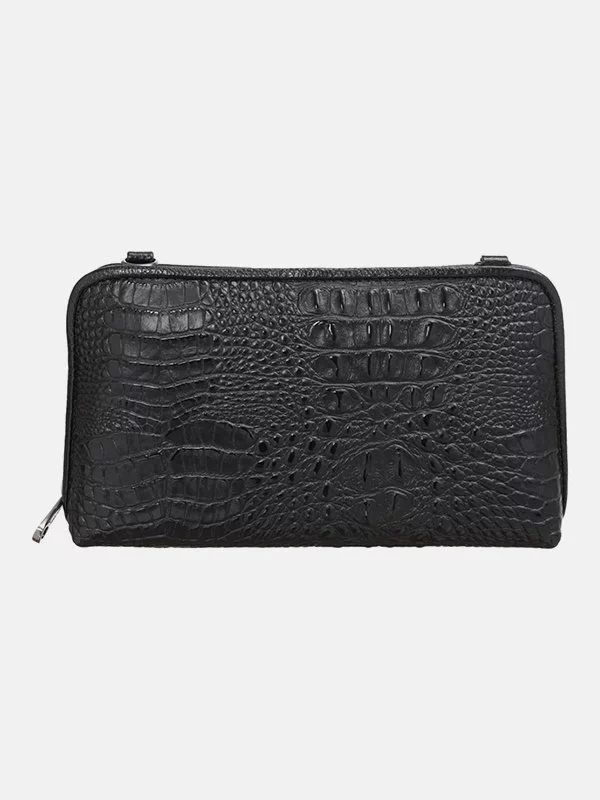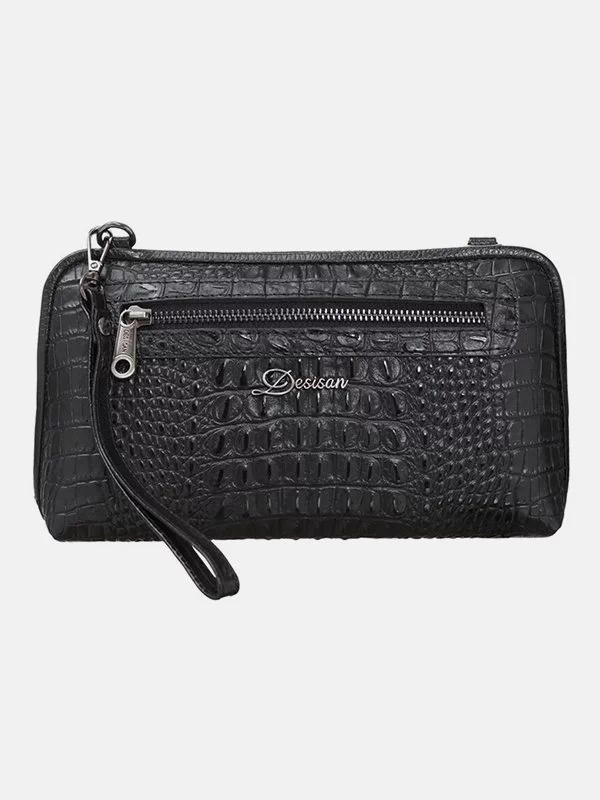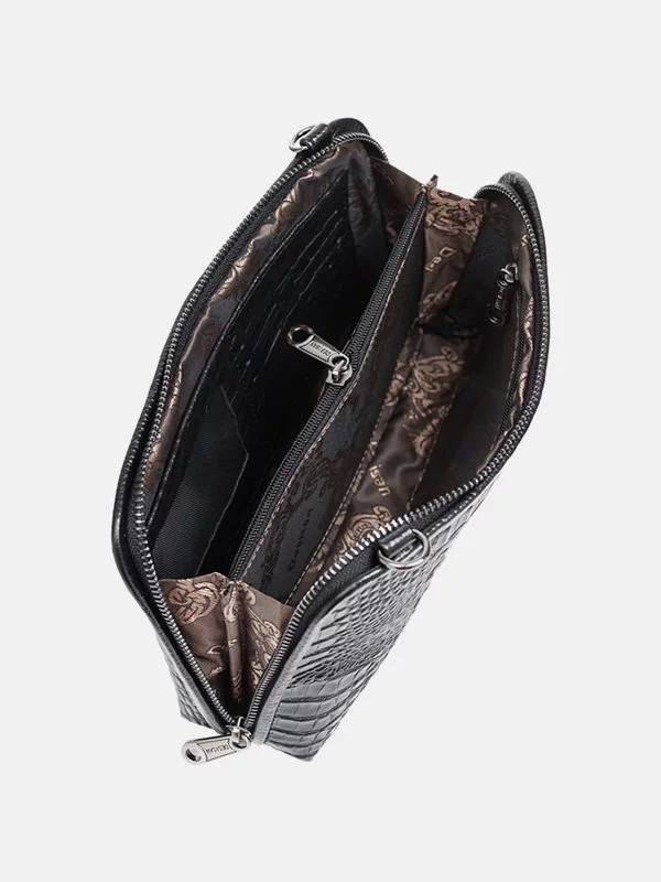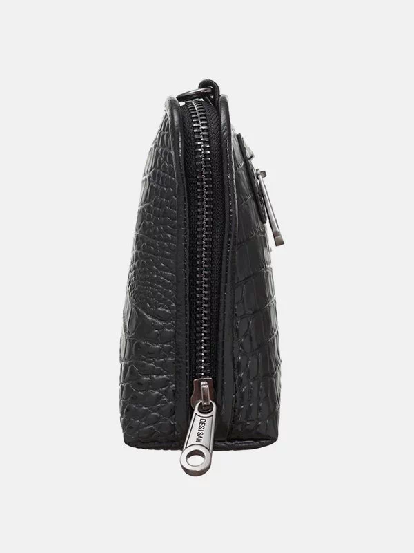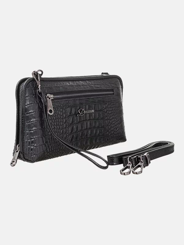 Женская сумка D-1210 – надежный вариант для денег, различных мелочей (косметики, ключей, павербанков, наушников, смартфонов, зарядных устройств и т.п.). Пошита из фактурной натуральной кожи «под крокодила» черного цвета. Сумка неприхотлива в уходе, имеет элегантный внешний вид, качественный пошив. Удачно подчеркнет практически любой образ. Страна производитель бренда – Турция.