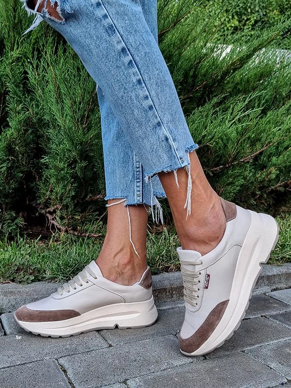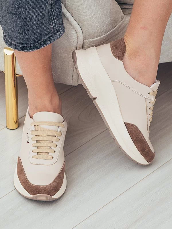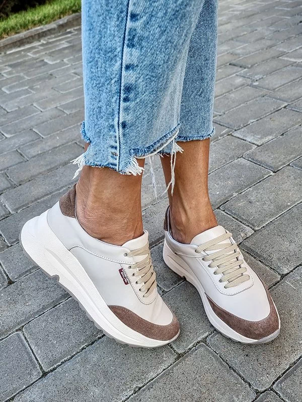 Бежевые кожаные кроссовки с коричневыми вставками из замши
