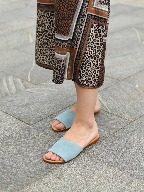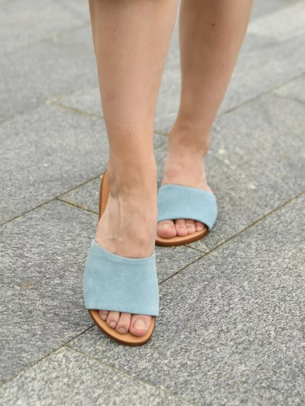 Велюровые шлепанцы голубого оттенка на тонкой подошве