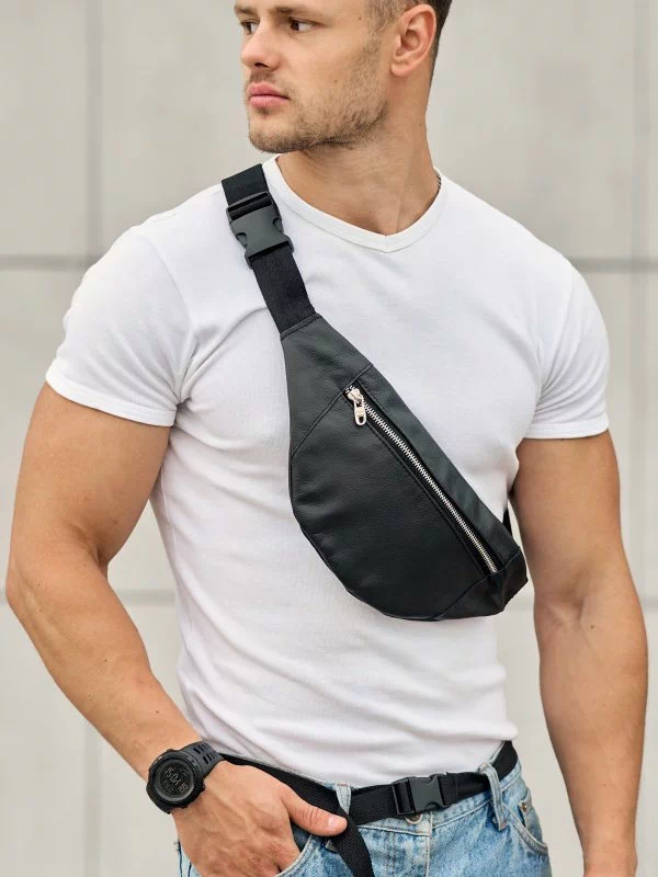 Изысканная мужская сумка-бананка чёрного цвета на любые случаи жизни.