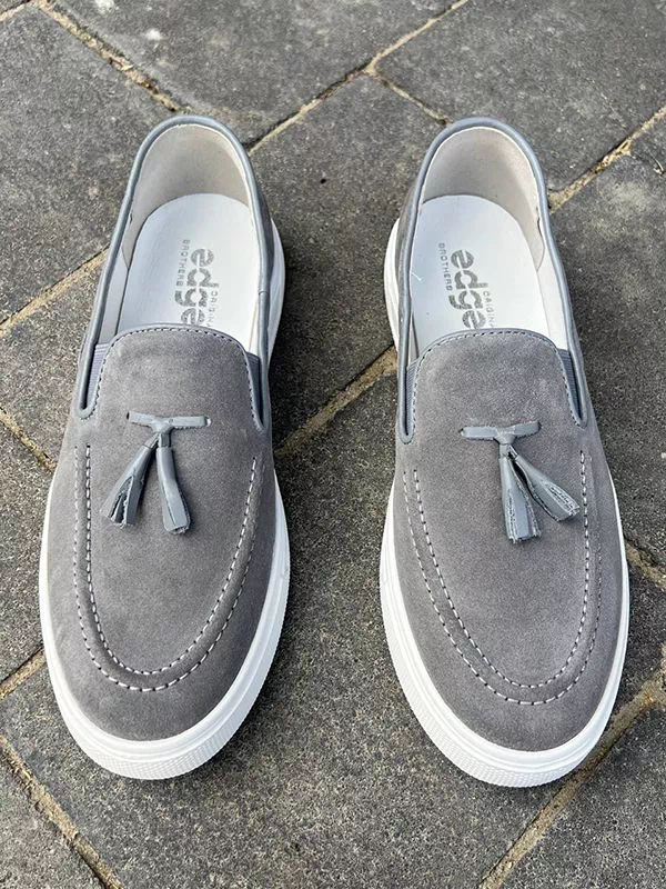 Сірі замшеві лофери з китицями на білій спортивній підошві