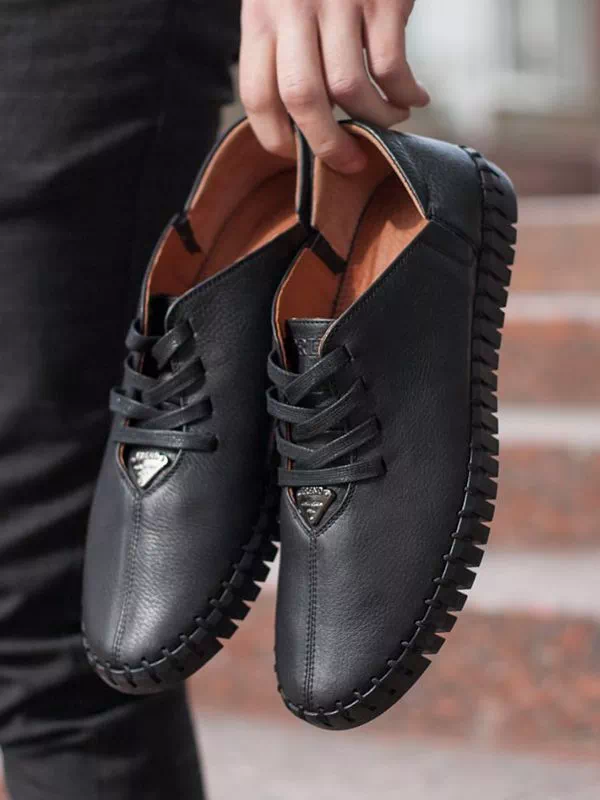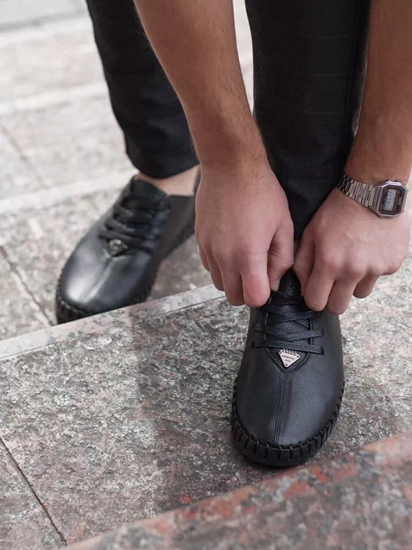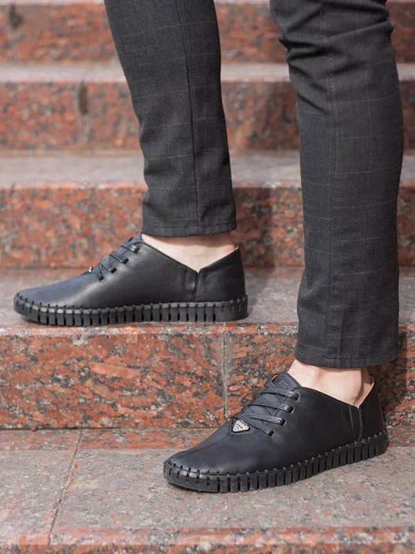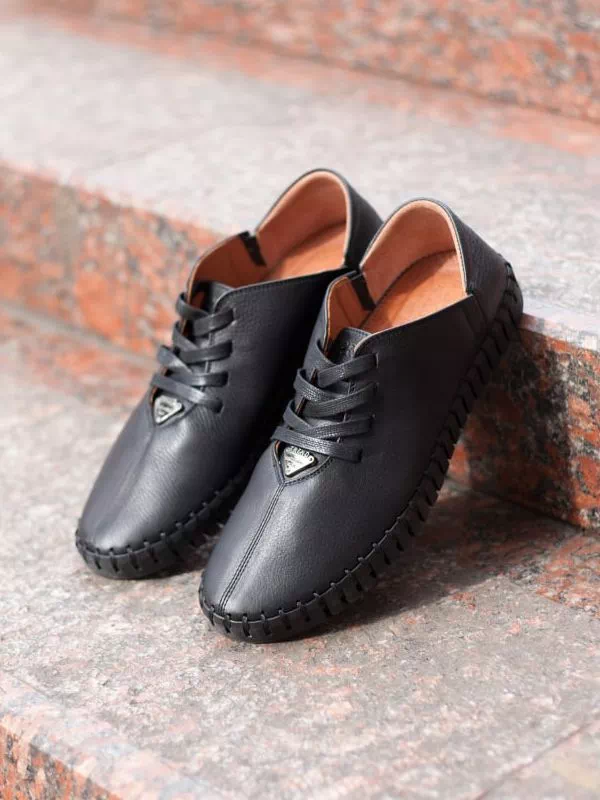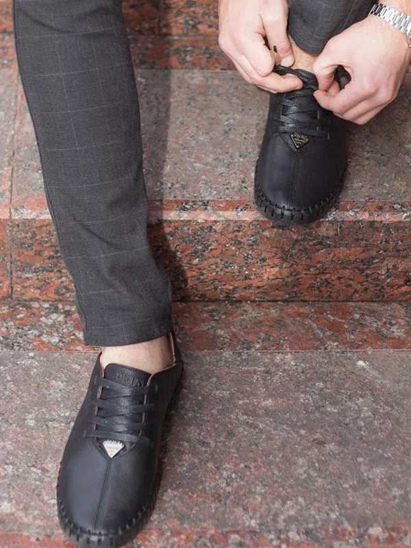 Трендовые черные мокасины из фактурной кожи со шнуровкой