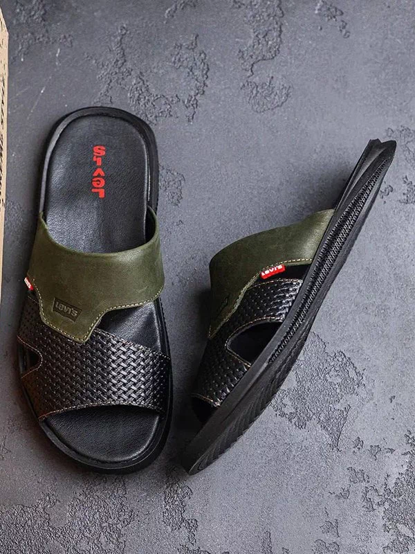 Чорно-оливкові шльопанці з натуральної шкіри